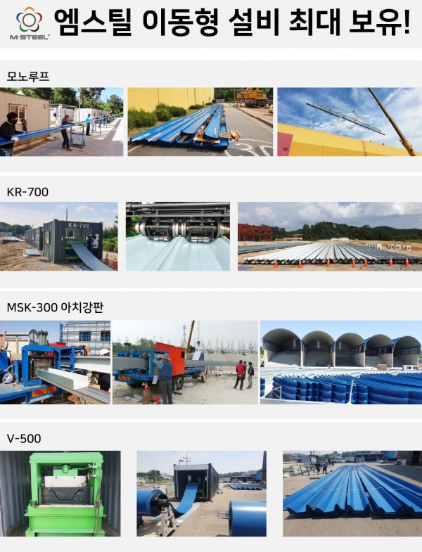 특히 엠스틸은 이동형 성형기를 보유하고 있어 직접 현장에서 제품 생산이 가능하다. 징크강판, 성형강판, 툭수성형기와 등의 제품을 운반이 불가능한 길이로도 현장에서 생산할 수 있어 고객사들이 원하는 제품을 생산할 수 있다.