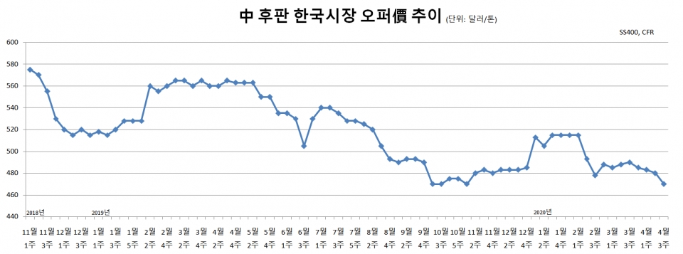 수입업계에 따르면 4월 셋째 주, 중국 후판 제조업체들의 한국행 오퍼가격은 평균 톤당 470달러(CFR)를 기록했다. 전주 대비 톤당 10달러 수준 인하된 가격이다.