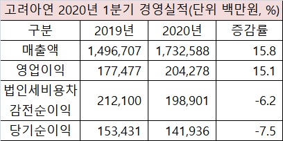 고려아연은 27일 1분기 연결기준 영업(잠정)실적 공시를 통해 2020년 매출액이 전년 동기 대비 15.8% 증가한 1조7,325억8,800만원을 기록했다고 밝혔다.