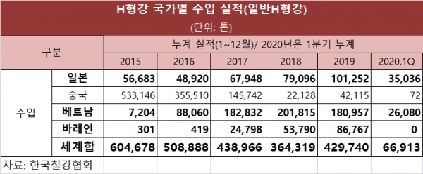 일본계 H형강 세력의 확장세가 두드러지고 있다. 2020년 1분기 국내로 수입된 H형강 제품의 물량은 전년과 비교해 크게 줄었으나, 일본계가 차지하는 비율은 향후 크게 늘어날 우려가 존재한다.