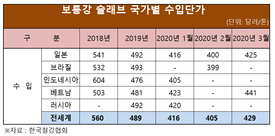 1분기 국산 슬래브 수출단가는 톤당 406달러로 전년 동기보다 톤당 62달러, 13.2% 인하됐다. 코로나19로 빚어진 글로벌 경제 둔화를 극복하기 위해 가격 경쟁력을 높이려 한 것으로 풀이된다.