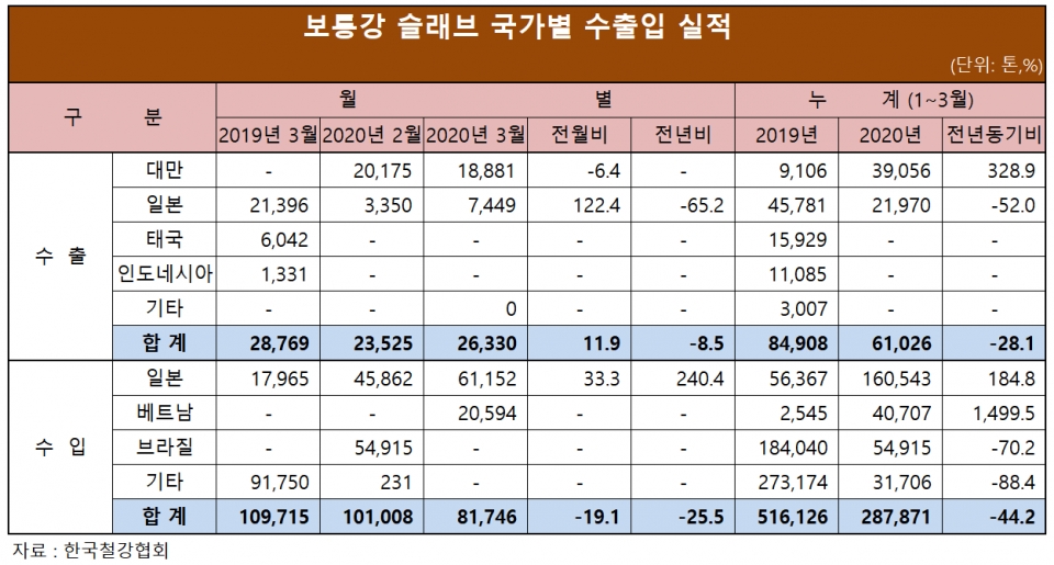한편 3월 한 달간 슬래브 무역실적은 수입 2만6,330톤, 수출 8만1,746톤을 기록했다. 전월 대비 수입은 19.1% 감소, 수출은 11.9% 증가했다.