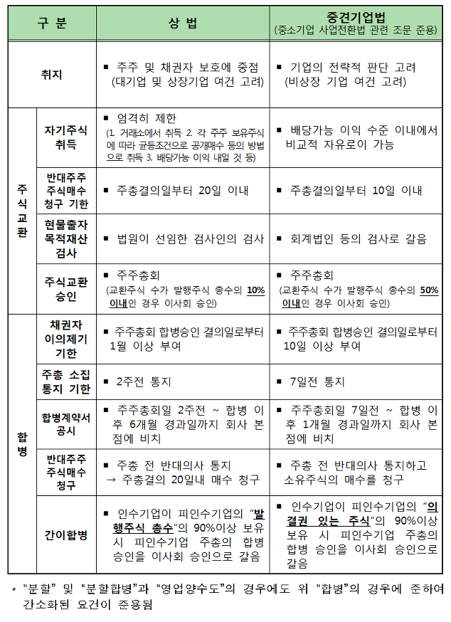 한편 지난해 7월, 기존 중소기업에게만 적용되던 사업전환 특례(중견기업 특별법 개정안)가 중견기업까지 확대된 바 있다. 법 개정으로 비상장 중견기업(3년 평균 매출액 3,000억원 미만)은 사업전환을 위해 주식을 교환하거나 합병, 영업양수도 등을 추진할 때, 완화된 관련 절차와 요건을 적용받게 됐다. 3년 평균 매출액 3천억 원 미만 비상장 중견기업은 전체 중견기업(4,635개/2018년 결산기준)의 47.2%(2,192개) 수준에 달하고 있다.
