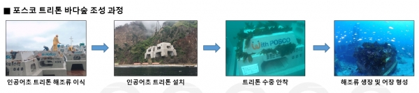 포스코는 지난해 12월부터 울릉도 주변 수중 탐색을 통해 바다숲 조성이 가능한 최적의 위치를 선정하고 지난 4월에는 지반 및 현존 생물 서식현황 등 정밀조사를 실시했다. 이달에는 트리톤을 울릉도로 옮겨 수중에 안착시켰다. 향후 포스코와 울릉군은 생물현황 및 수질 조사뿐 아니라 해조류 보식과 수산자원의 번식에 해가 되는 해적생물의 구제(驅除)등 사후 관리도 지속 실시키로 했다.