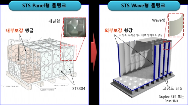 ‘스테인리스 웨이브형 물탱크’는 물결 모양의 고강도 스테인리스(STS) 패널로 외부 벽체를 구성하고 패널 사이에 외부 보강재로 H형강을 적용한 물탱크로, 기존 패널형 물탱크와 달리 내부에 보강 구조재가 없어 공간 활용이 뛰어나고 유지 및 보수에 유리한 제품이다.