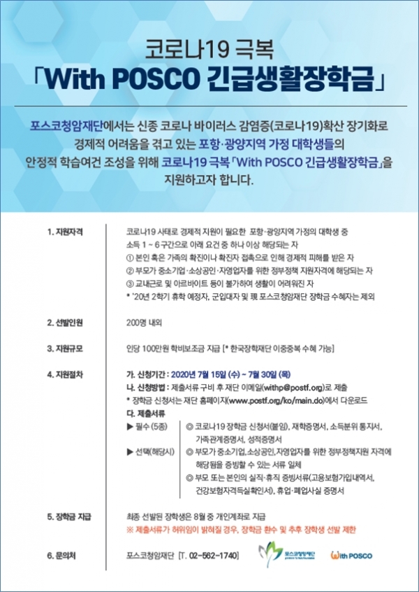 「With POSCO 긴급생활장학금」선발대상은 올해 기준중위소득 60% 이하인 포항·광양지역 가정의 대학생으로, 코로나19 사태로 인해 부모가 실직이나 폐업을 당해 가정경제가 급격히 어려워졌거나 아르바이트 일자리를 잃어 생활이 어려워진 학생이다. 선발인원은 200명 규모이며 금번 선발된 학생들은 인당 100만원의 학비보조금을 8월 중 지급받게 된다.