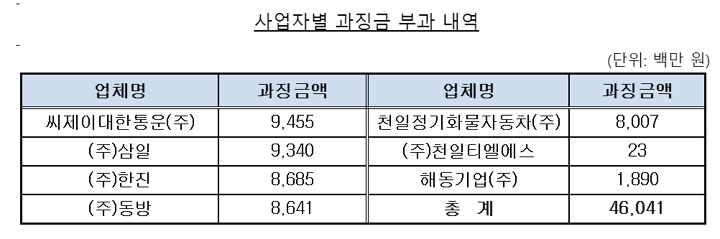CJ대한통운 94억5,500만원, 삼일 93억4,000만원, 한진 86억8,500만원, 동방 86억4,100만원, 천일정기화물자동차 80억700만원, 천일티엘에스 2,300만원, 해동 18억9,000만원의 과징금을 물게 됐다.