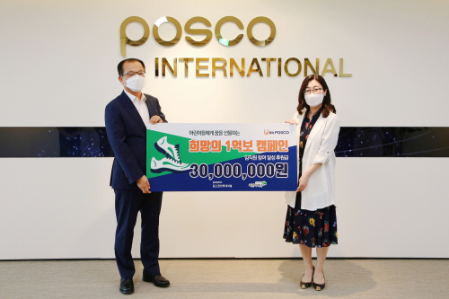 포스코인터내셔널(대표 주시보)은 ‘어린이들에게 꿈을 선물하는 희망의 1억보 걷기 캠페인’을 통해 기부금 3,000만원을 마련해 초록우산어린이재단에 전달했다고 21일 밝혔다.
