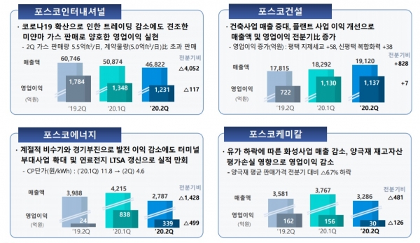 포스코건설은 건축사업 매출 증대, 플랜트 사업 이익 개선으로 매출액 및 영업이익 전분기대비 증가했다. 포스코에너지는 계절적 비수기와 경기부진으로 발전 이익 감소에도 터미널 부대사업 확대 및 연료전기 LTSA 갱신으로 실적을 만회했다.