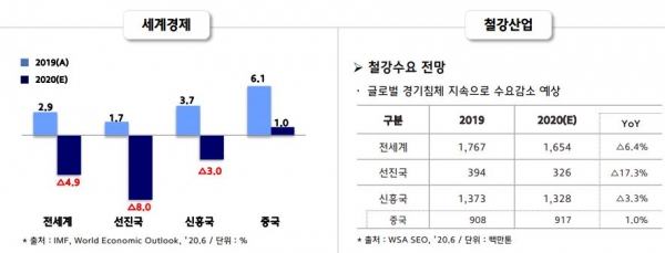 현대제철이 발표한 자료에 따르면 세계경제는 글로벌 유동성 강화 및 각국 부양책 발표로 경기회복이 기대된다. IMF와 세계은행에 따르면 올해 세계경제 성장률은 전년 대비 -4.9%, 선진국은 -8.0%, 신흥국은 -3.0%의 성장률을 보이며 역성장할 것으로 예상된다. 중국 또한 성장률이 크게 하락하여 1.0% 성장에 머물 것으로 보인다.