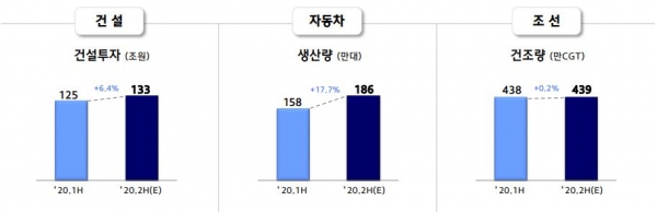 자동차산업은 하반기에 큰 폭으로 회복될 것으로 예상된다. 산업연구원에 따르면 하반기 자동차 생산량은 186만대로 158만대를 생산한 상반기 대비 17.7% 증가할 것으로 보인다.