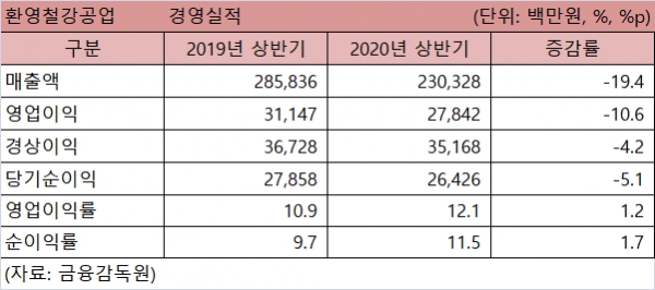 환영철강공업의 2020년 상반기 매출액과 영업이익 감소는 제품 판매량 감소에 따른 것으로 풀이된다. 2020년 상반기 환영철강공업의 철근 생산은 약 30만7천톤 수준을 나타내 지난해 같은 기간 생산량 약 37만2천톤 대비 6만톤 이상 줄었다. 다만 2020년 상반기 국내 철근 시황이 다소 안정적인 흐름을 보이며 수익성 개선에 영향을 준 것으로 보인다.