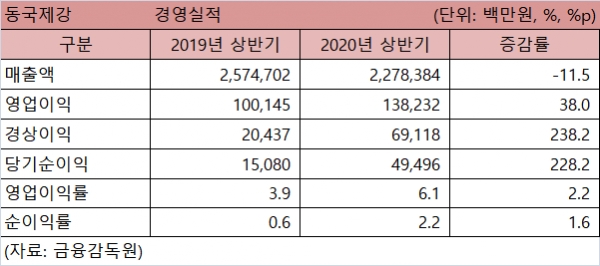 2020년 상반기 실적과 관련해 동국제강은 “코로나19 확산 등에 따른 철강 수요 부진으로 매출은 감소했으나, 지속적인 원가절감 노력과 고부가가치 제품 판매 확대로 수익성이 크게 개선됐다”며 “동국제강은 탄력적 조업이 가능한 전기로 사업의 장점을 극대화하는 데 주력했으며, 이를 통해 봉형강 사업의 수익성을 방어하는 데 성공했다”고 설명했다.