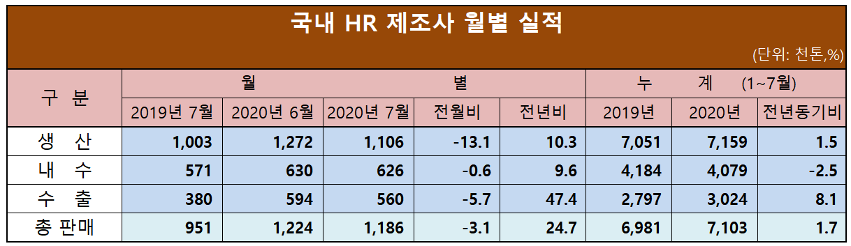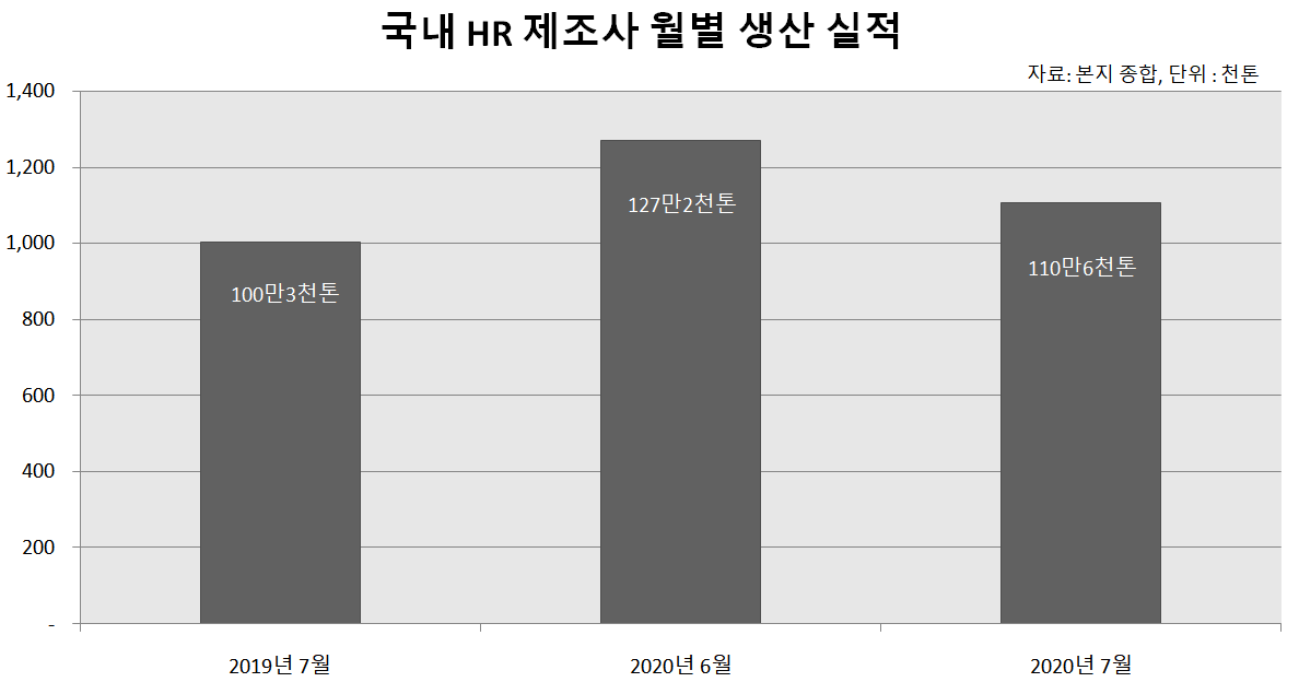 7월 판매고는 전체 판매에 47%(물량 기준)를 수준을 차지하는 수출 부문이 부진했기 때문으로 풀이되고 있다. HR 제조사들의 7월 수출량은 56만톤으로 전월 대비 5.7% 감소했다.