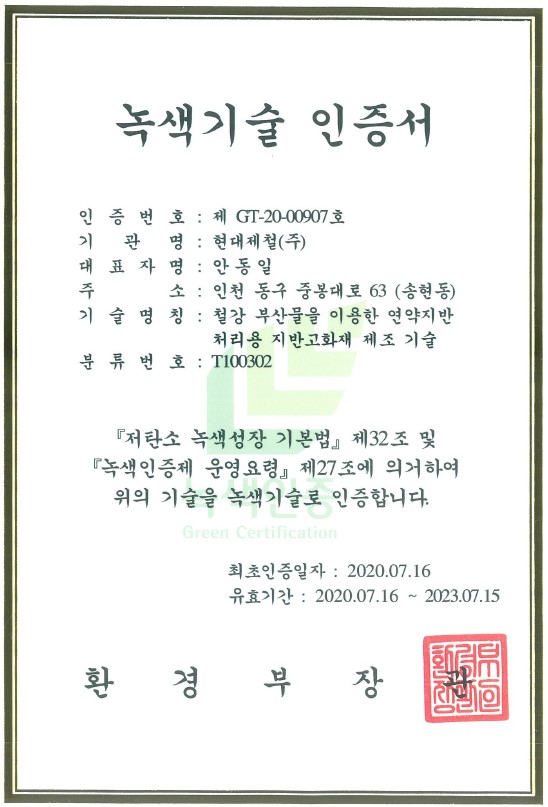 현대제철(대표 안동일)이 현대건설과 함께 ‘철강 부산물을 이용한 연약지반 처리용 무(無)시멘트 지반 고화재’ 기술로 녹색기술 인증을 받았다.
