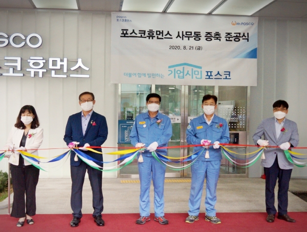 포스코휴먼스는 포스코가 2007년 국내 최초로 설립한 국내1호 자회사형 장애인표준사업장으로 설립 초기 57명이였던 장애직원수가 8월 현재 287명으로 5배 가량 증가하고, 매년 장애직원 채용이 늘어나는 상황에서 부족한 사무공간 확보와 근무환경 개선을 위해 사업장인 세탁동 옆에 사무동을 이번에 새롭게 증축했다.