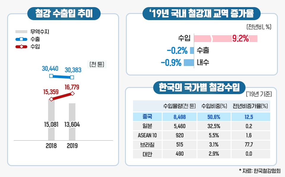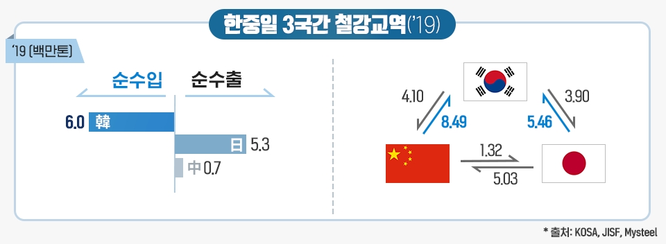 국내로 유입되는 수입재의 영향으로 한국 철강사들은 오랫동안 생산 물량을 국내가 아닌 수출로 소화해야 하는 기형적인 수출입 구조가 고착되어 왔다. 전통적인 소부장(소재, 부품, 장비) 산업 강국인 독일과 일본은 자국의 고품질 국산 소재를 적극 사용해 자국 시장에서 철강 수입 비중이 각각 16%와 10%에 그치는데, 이는 한국의 철강 수입 비중이 31%인 것과 크게 대비된다.