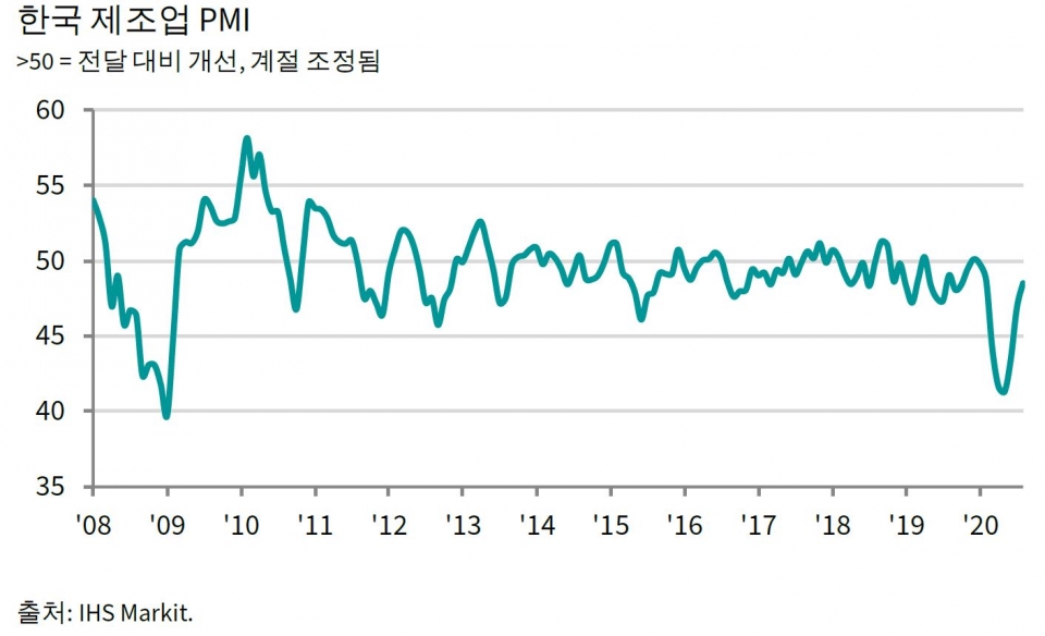 시장조사업체 IHS Markit과 Nikkei가 조사한 자료에 따르면, 한국의 8월 제조업 PMI는 48.5을 기록하며, 전월 지수 46.9보다 1.6포인트 상승한 것으로 집계됐다. 이에 따라 PMI지수는 지난 5월 41.3을 저점으로 3개월 연속 상승했다.