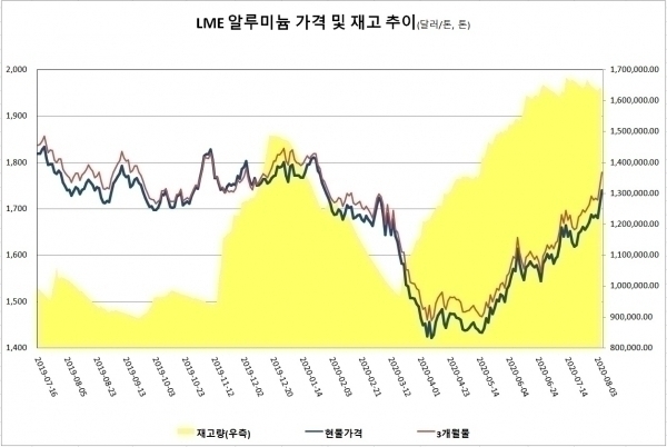 한편, 9월 LME 알루미늄 평균 가격은 톤당 1,780달러, 3개월물은 톤당 1,816.5달러로 전월 대비 46.1달러, 45달러 각각 상승했다.