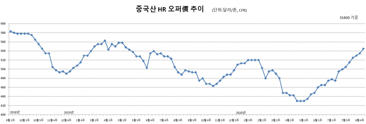 수입업계에 따르면 9월 첫째 주, 중국 HR 제조사들의 한국행 수출 오퍼가격은 FOB 기준 톤당 535달러, CFR 기준 톤당 545달러를 기록했다. 전주 대비 톤당 10달러 수준 인상됐다.