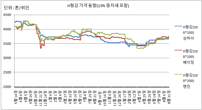 9월 7일 중국 상하이 지역 H형강 가격은 3,680위안(200*200)을 기록해 직전 영업일인 9월 4일과 같은 가격을 나타냈다. 7일 베이징 지역 H형강 가격 또한 3,740위안으로 가격을 유지했다.