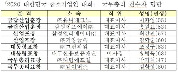 정세균 국무총리는 금탑(2명), 산업포장(2명), 대통령표창(2명), 국무총리표창(2명)을 받은 중소기업인 대표 8인에 대해 직접 포상을 전수하였으며, “어려운 대내외 여건 속에서도 제2의 벤처 붐 확산 등을 일으키고 있는 중소기업인의 성과를 축하하고, 앞으로도 중소기업의 혁신역량 강화, 상생협력 및 창업‧벤처 열기 확산 등을 위해 정부의 지원역량을 결집하겠다”고 밝혔다.