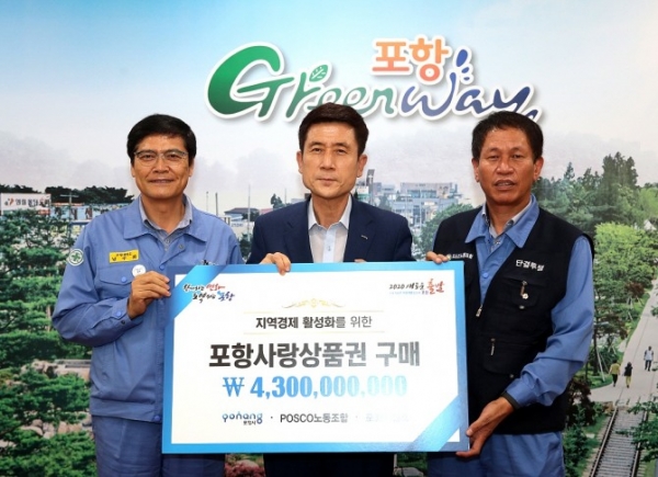 한편 포항지역 포스코 협력사도 총 45억원 어치 포항사랑 상품권을 구입, 각 사별로 추석 전까지 임직원 9,000명에게 1인당 50만원씩 지급할 계획이다.