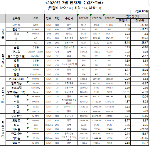 철강재의 경우 슬래브는 수요 증가와 공급 감소가 겹치면서 가격이 상승했고, 열연강판은 중국의 내수 유통가격과 선물가격이 7월 23일 기준으로 최고치를 기록하면서 가격이 상승했다. 철스크랩과 빌렛은 수요 증가로 인해 가격이 상승했고, 철근 또한 수요 증가로 인해 소폭 상승했다. 선철은 중국의 내수 수요 증가에 따라 가격이 상승했다. 반면 H형강은 코로나19로 인한 경기침체 영향으로 가격이 하락했다.
