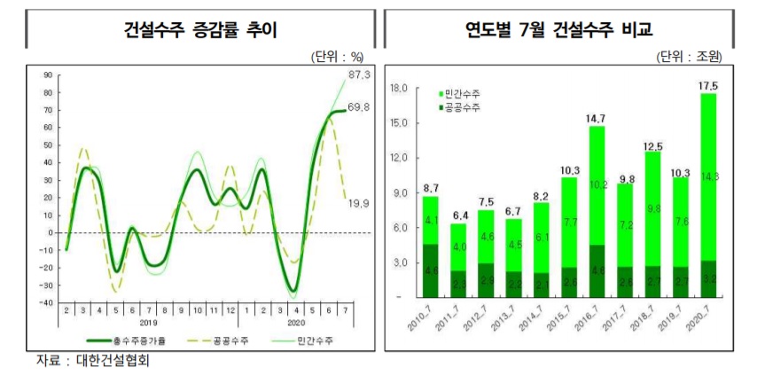 민간 부문의 경우 토목수주는 7월 들어 대형 석유화학 플랜트 수주의 영향으로 전년 동월 대비 무려 219.7% 급등한 2조7,000억원을 기록해 7개월 만에 다시 증가세로 돌아섰다. 같은 기준 주택수주는 민간택지 분양가상한제를 앞두고 수주가 급격히 증가해 8조2,000억원을 나타내며 전년 동월 대비 169.7% 증가했다. 다만 비주택 건축수주는 전년 동월 대비 9.0% 감소한 3조4,000억원을 나타내기도 했다.