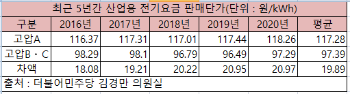 국회 산업통상자원중소벤처기업위원회 소속 더불어민주당 김경만 의원(비례대표)이 한국전력공사를 통해 제출받은 국정감사 자료를 분석한 결과, 지난 5년간 고압A를 주로 쓰는 중소기업의 판매단가는 평균 117.28원/kWh, 고압B·C를 주로 사용하는 대기업의 판매단가는 평균 97.39원/kWh으로 중소기업이 대기업보다 평균 17%(19.89원/kWh) 비싸게 전기요금을 부담해 온 것으로 확인됐다.