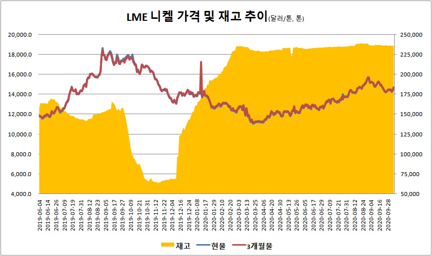 그럼에도 불구하고 니켈 가격은 또 한 번 상승하며 순항을 이어가고 있다. 도널드 트럼프 미국 대통령의 조기 퇴원 소식과 미국 신규 부양책 합의 기대로 위험자산 선호 심리가 유지되는 분위기가 이어지고 있기 때문이다. 다만 코로나19 확산세가 커지고 있고, 미국 대선을 앞두고 불확실성이 커지는 가운데 적은 거래량과 함께 시장은 방향을 잡지 못하고 있다.