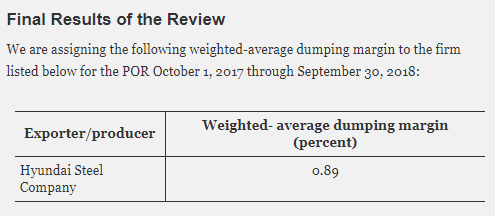 지난달 30일, 미 상무부는 2017년 10월부터 2018년 9월까지(POR) 진행된 한국산 열연강판에 대한 2차 반덤핑 연례재심을 최종 판단했다. 6일 공개된 자료에서 상무부는 한국 철강사들이 공정가치(정상가격, LTFV)보다 낮은 가격대에 제품을 판매하고 있다며 현대제철 등에 가중덤핑률 0.89%를 산정했다. 지난 2차 예비판정 당시 덤핑률 0.94%보다 0.05%p 낮아졌다.