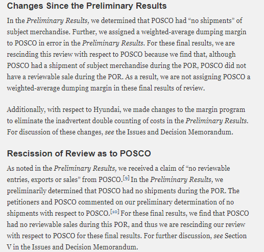 상무부는 “지난 예비결과 판정 등에서 포스코에 잘못된 가중덤핑마진을 부여한 바 있다”며 “포스코가 POR 기간 동안 상품을 선적한 바는 있지만 확인 가능한 판매는 발견되지 않았다”라고 설명했다. 이에 예비판정 이후 검토를 다시 진행한 결과 가중덤핑마진 부과를 하지 않기로 결정했다.