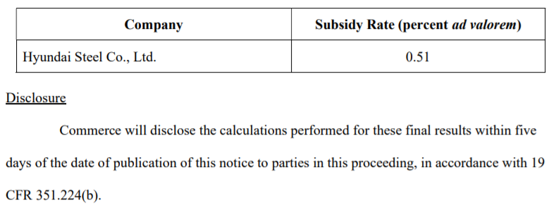 상무부는 이번 2차 최종판정에서 현대제철에 CVD 관세로 0.51%를 부과했다. 이는 2차 예비판정 관세 0.45%보다 0.06% 상향됐다. 미소마진(De Minimis) 기준인 0.5%를 초과하는 수정치다.