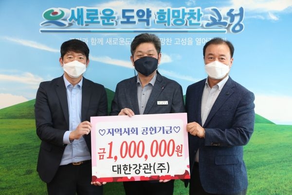 대한강관은 고성군청을 방문해 지역사회공헌기금 100만원을 전달했다.