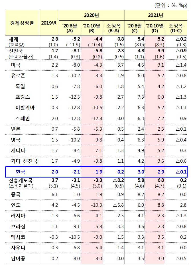우리나라는 기존 전망에 비해 0.2%p 올린 -1.9%로 예상했다. IMF는 지난 6월 전망에서는 코로나19 타격을 고려해 우리나라 성장률 전망치를 4월보다 0.9%p 내린 -2.1%로 전망한 바 있다. 우리나라 전망치는 OECD 회원국 37개국 중에서도 리투아니아(-1.8%)에 이어 두 번째로 높고 IMF가 분류하는 선진국 39개국 중에서는 대만(0.0%), 리투아니아에 이어 세 번째를 차지했다.