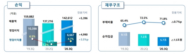 그룹사 차원의 현금흐름 중시 경영 강화로 자금시재는 증가했으며 차입금은 감소해 부채비율을 개선했다.