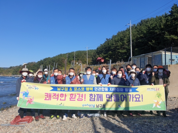 이번 환경정화 활동은 포스코엠텍과 포항시 남구청 직원 및 희망일자리사업 참여자 등 50여명이 참여했으며 호미반도 해안둘레길 주변의 해안쓰레기 수거 및 환경정비와 함께 환경보호캠페인을 실시했다.