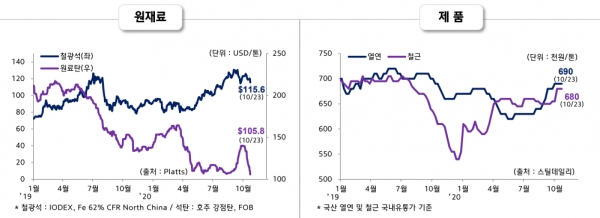 제품 부문의 경우 10월 초 중국의 국경절 연휴가 끝난 후 수요 개선 기대감이 커지면서 철강 가격이 상승세를 보이고 있다. 게다가 최근에는 글로벌 자동차산업 경기가 회복되는 등 수요산업의 가동률이 전반적으로 상승하면서 철강제품 가격이 강세를 보일 것으로 예상된다.