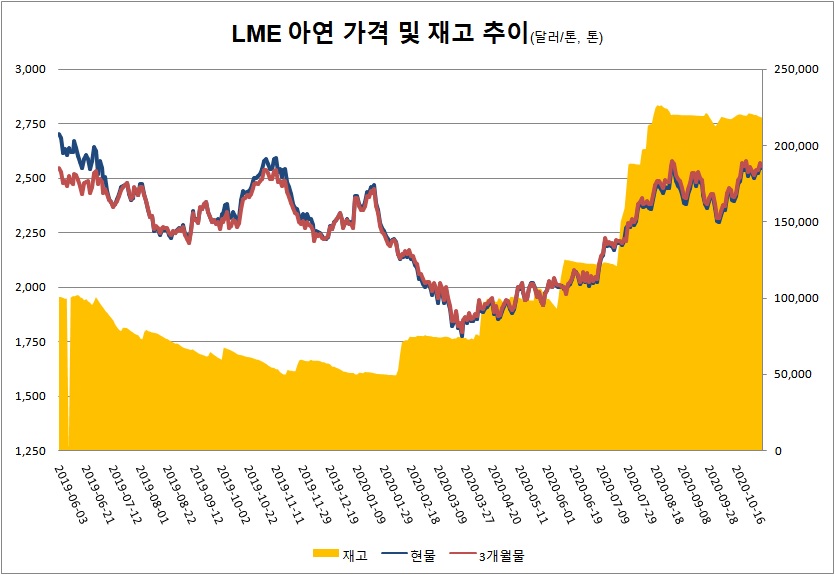 그러나 아연 가격은 주요 증시의 상승과 LME 아연 재고 감소에도 하락했다. 이는 추가 경기부양 패키지 협상이 난항을 겪을 것이라는 우려 때문으로 분석된다. 다만 대선 결과의 혼선에도 달러 약세가 지속되고 있어 향후 아연 가격은 강세를 유지할 것으로 전망된다.