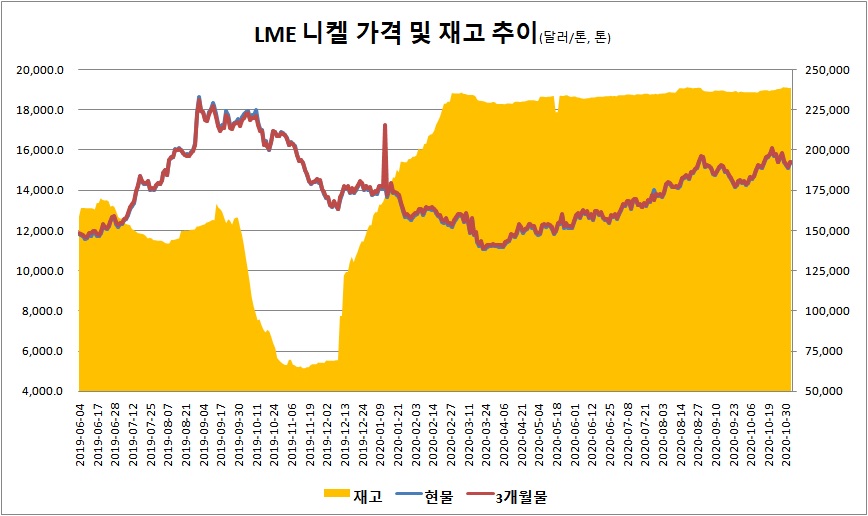 런던금속거래소(LME) 니켈 가격이 추가 상승했다. 11월 4일 기준 LME 니켈 가격은 톤당 1만5,391달러로 전일 대비 26달러 상승했다. 니켈 재고는 전일 대비 282톤 증가한 23만8,956톤을 기록했다.
