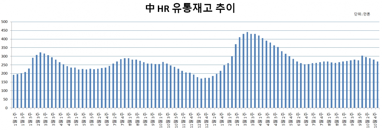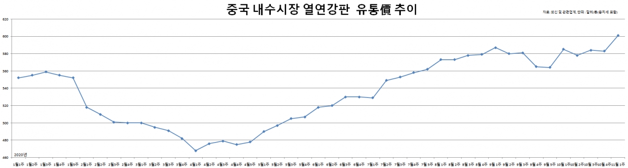 철강업계 및 외신에 따르면 11월 첫째 주, 중국 HR 유통가격은 톤당 601달러(증치세 포함)를 기록했다. 전주 대비 톤당 18달러 상승했다. 지난 5월부터 강세를 나타내더니 7개월 만에 톤당 130달러 수준이나 급등했다.