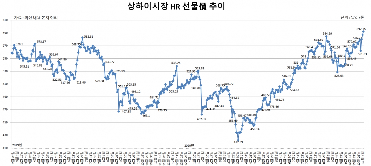 이에 한국행 수출가격에 영향을 주는 선물 가격도 연중 최고가를 경신했다. 첫째 주, 상하이 선물거래소의 HR 거래가격은 톤당 580달러를 기록했다. 전주 대비 톤당 9.2달러 상승한 가운데 2년래 주간가격 최고가를 새로 썼다.