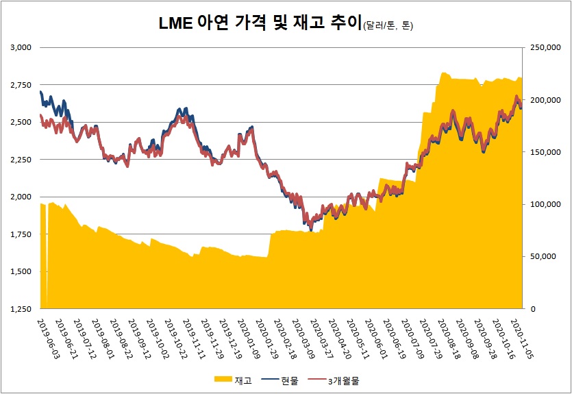 런던금속거래소(LME) 아연 가격이 다시 상승 전환했다. 11월 13일 기준 LME 아연 가격은 톤당 2,612.5달러로 전일 대비 19.5달러 상승했다. 아연 재고는 전일 대비 25톤 감소한 22만1,050톤을 기록했다.