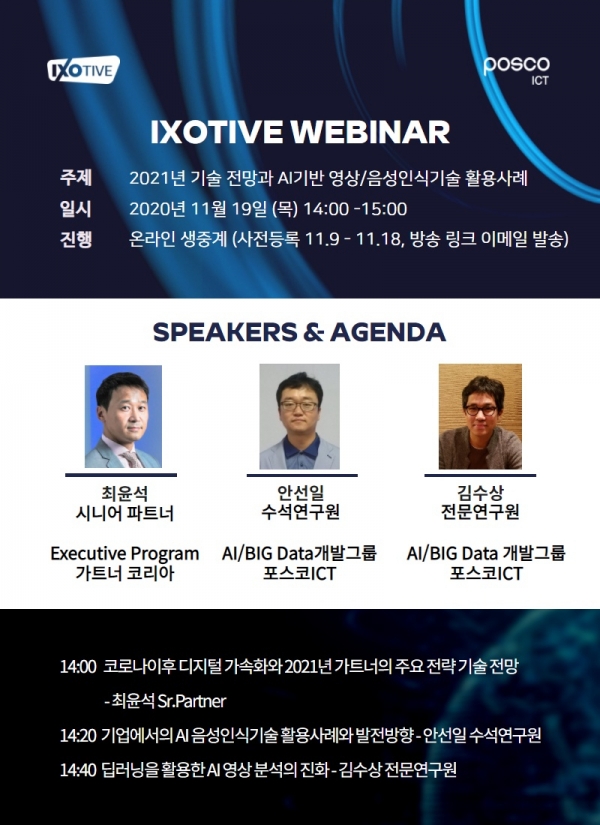 포스코ICT(대표 손건재)가 글로벌 IT시장조사 전문기업인 가트너와 함께 오는 19일 2021년 기술 트렌드 전망 ‘IXOTIVE 웨비나(온라인 세미나)’를 개최한다.