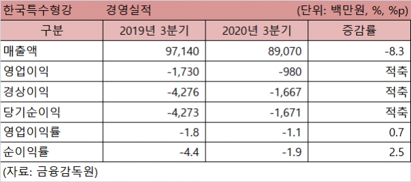 한편 한국특수형강의 2020년 3분기 누계 기준 매출액은 2,736억8,300만원으로 지난해 같은 기간 대비 12.3% 줄었으나, 영업이익은 62억8200만원을 기록해 전년 동기 대비 흑자전환했다.