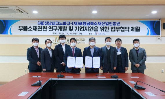 포항금속소재산업진흥원(원장 이종봉)이 전남테크노파크(원장 유동국)과 부품소재관련 연구개발과 기업지원을 위한 업무협약을 17일 전남테크노파크 2층 중회의실에서 개최했다고 밝혔다.