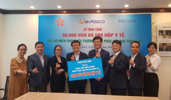 포스코는 18일 베트남 중부 지역 태풍 피해 주민들을 위해 스테인리스 물탱크 300개와 비상의료키트 500개 등 약 5,500만 원(5만 달러) 상당의 기부품을 베트남 정부 산하 인민원조조정위원회(PACCOM)에 전달했다. 포스코 스테인리스 소재로 제작된 물탱크는 식수 공급난이 심각한 중부 꽝남(Quang Nam)과 트어 티엔 회(Thua Thien Hue)지역에 우선 설치될 예정이다.