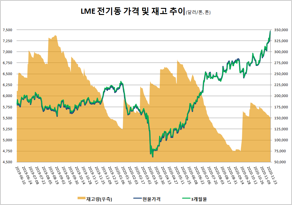 지난 27일 런던금속거래소(LME)에서 거래된 전기동 현물가격은 전일대비 105.5달러 오른 톤당 7,462달러를, 3개월물 가격은 106달러 상승한 7,476.5달러를 각각 기록했다. 마감종가는 두 개의 가격 모두 7,500달러를 넘어서며 초강세를 이어갔다.