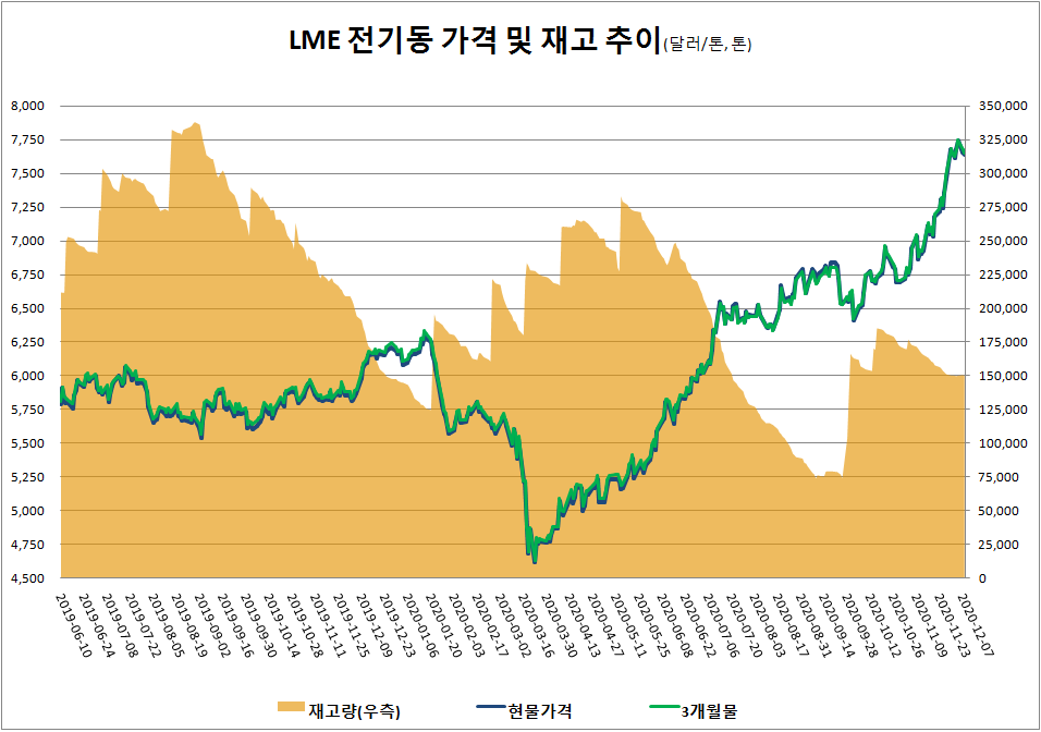 2거래일 연속 하락에도 불구하고 전기동 가격은 톤당 7,600달러 선을 상회하는 등 상승 모멘텀은 여전히 남아 있다. 현재 가격 수준이 2021년 수요 반등에 의해 지지될 것으로 전망되고 있다. 이와 관련해 피치솔루션은 중국 수요가 유지되는 동안 다른 지역 수요 회복이 공급 부족 기조를 확대시킬  것으로 내다봤다.